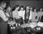 Star-Telegram Junior Shots. Left to right: Johnie Borders, Mrs. W. F. Morgan, Miss Libby Force, Miss Pauline Bentley, Pop Grace, Miss Mabel Grace, Miss Kathryn Winn, and Miss Veda Sue Donley. The group is shown crowded around a table that's covered in a variety of items that include small rolls of paper, boxes and books. Mr. Grace and Mrs. Morgan are preparing to open their gifts received at the party given by Miss Grace, while the others look on. It appears that everyone is smiling widely and talking to each other.
