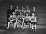 The Birdville Buffaloes champions of District 11A, who met at Gatesville Thursday night for their first round of playoffs for the Regional Three title. Left to right, first row: Junior Brown, J.B. Heatherly, Dub Stewart, Charles Parr, back row: Coach Johnny Nobles, Cecil Carpenter Roy Taylor, Alfone Knapp, and Coach W.A. Porter. A team photograph with the coaches on either side of the players. They're seating in the bleachers and posing for the photograph.
