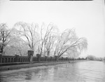 Photograph taken from the Stove Foundry Road overpass where it crosses University Drive in Trinity Park, Fort Worth, Texas. A picture of a bridge that is iced over with trees that have ice sickles on them after a winter storm of hail, sleet, and rain. Star-Telegram Evening Edition February 27, 1945