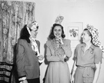 Goofiest Hat contestants. Left to right, Mrs. Eric C. Hyden Junior wearing a decorated strainer; Mrs. Thomas Law wearing a funnel with flowers, and Mrs. F. Irby Cobb wearing a novel turban.