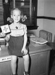 Red Cross. Shirley Kozel. Shirley is sitting on top of desk holding up a small Red Cross symbol. She is smiling and wearing a dress with corduroy detailing. Her hair is in pigtails with small bows. On the desk there is a couple of books and a few documents. She has two sisters; Judy and Carol Ann Kozel.
