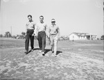 Among the hundreds of golfers playing on the Fort Worth courses, three of the most consistent low scores are, left to right, L. D. Hardin, Derald Lehman and J. H. (Doc) Brinkley, leaving a tee at Western Hills Country Club of Ridglea. They are holding their golf clubs and walking next to each other. Published in the Fort Worth Star-Telegram morning edition, March 3, 1946.