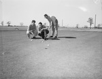 Service returnees derive fun and relaxation from the great outdoor sport. Studying a putt at Western Hills Country Club of Ridglea are, left to right, Joel Klar, who was on Okinawa; Carl Hoera, Guam veteran, and Bill Grubbs, who served in the European Theater of Operations. They are playing golf. Published in the Fort Worth Star-Telegram morning edition, March 3, 1946.