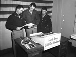 Army show in connection with Stock Show. Major Stanton Rhome, Colonel Everett W. Duvall and Lieutenant Colonel Robert W. Walton, in left and right order, are shown making final plans the Army Exhibition to be held in conjunction with Southwestern Exposition and Fat Stock Show. The three men wearing military uniforms are reviewing various photographs that are on a desk. There is a sign on the desk that says "Fourth Army Exhibition Detachment". Star-Telegram Morning Edition March 4, 1946
