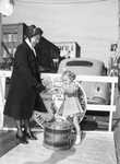 Charlene Coughran, 3, daughter of Mrs. Lucille Coughran, is adding her bit to the Elks Club "Mile of Dimes". Mrs. W. T. Johnson of the Salvation Army, left. A little girl donating money for the campaign for crippled children. The young child, Charlene, is dropping money into a container held by Mrs. Johnson. Charlene is wearing a dress and coat. Mrs. Johnson is wearing a long coat, bonnet, and gloves. There is a drum laying on the ground between the pair with money on top and a car parked behind them. There is a sign designating the charity. Star-Telegram Evening Edition December 8, 1945