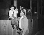 Southwestern Exposition and Fat Stock Show. Charles Barnett, 3 years old son of another calf roper, Keith Barnett of Dallas, Texas is sitting on a fence in a corral. The child is wearing a cowboy hat, overalls, jacket, and cowboy boots. His left hand is raised and resting against a fence support beam. An unidentified man, potentially his father Keith Barnett, is standing right next to the young boy. He is wearing a cowboy hat and jacket. Star-Telegram Morning Edition March 5, 1946