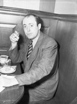 Harold Kennedy, actor, playwright, producer and lecturer. Kennedy arrived from New York, spoke on "Personalities, play and players" at the Woman's Club for the third consecutive year. He is shown here finishing a meal in a restaurant booth.