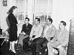 The Fort Worth Cats, a minor league affiliate of the Brooklyn Dodgers, are preparing for the upcoming 1946 season. Players are shown arriving at the LaGrave Field Office. Office Secretary Ruth Dale is taking the names of early arrivals. The players, sitting left to right, are Eddie Yaeger, Joseph "Alphabet" Wojciechowski, Ray Anderson, and Dick Davidson. Miss Dale is wearing a ruffled blouse, a pinstripe blazer and matching skirt. Yeager, an outfielder, is dressed in a suit with a sports coat. Wojciechowski, an infielder, is wearing a collared shirt, sweater, and trousers. Anderson, catcher, is wearing a button-up shirt, blazer, and trousers. Davidson, a pitcher, is dressed in a collared shirt, jacket, and trousers.