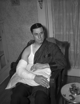 Virgil Harris, a convict from Iowa engaged in a gun battle with two Texas State Patrolmen near Lewisville Saturday night. State Patrolman Banks is shown recovering at his home. He sustained a severe flesh wound in his right arm. His right arm is bandaged and propped on a pillow. His partner, Patrolman Beasley took a bullet to the foot but was saved from injury by a steel arch support.
