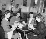 Southwestern Bell Telephone Company. Night operators, left to right: Miss Mozelle Dillard, Miss Evelyn Dowell, Miss Dorothy Lawrence and Miss June DeForeest. The group of ladies are shown having coffee together at a small table in a cafe. They plan returning to their posts after the 15-minute walk out. They appear to be smiling and talking to each other around the table. All of them are wearing a thick coat. Behind them are other, empty tables and a wall with pictures hung up.