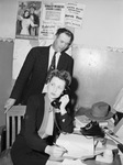 Southwestern Bell Telephone Company. Mrs. Lorella Spell, toll supervisor, and P. J. Beasley, president of local union. Mrs. Spell is shown sitting in chair in front of a table that has papers and books scattered about it. She's on a telephone calling the strike off. Mr. Beasley stands behind her chair wearing a dark suit and looks on. Mrs. Spell is wearing a dark skirt and jacket with a small scarf around her neck. Behind them is a wall with various posters stuck to. One of the posters involves the Red Cross.