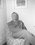 Hamilton Holt, Georgia industrialist and President of Kiwanis International. Mr. Holt is shown sitting in a patterned chair with his legs crossed and a slight smile. He is wearing a suit with a patterned tie and behind him is a wall with framed pictures hung up.