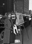 Mrs. Lucille Allen, Salvation Army worker, taking Christmas donations. Mrs. Allen is standing near a Salvation Army sign ringing a bell to encourage donations. She reminds a passerby to "keep the pot boiling" so the Salvation Army may fill Christmas baskets for the needy. Mrs. Allen is dressed in a long coat and bonnet. There are cars parked along the street and buildings in the background. Star-Telegram Evening Edition December 8, 1945