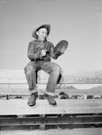 Clipping reads: "It's stock show time! Beating out the show call for the Pecos County 4-H Club boys at the Southwestern Exposition and Fat Stock Show Friday was 11-year-old Larry Powell of Iraan, Texas." The young boy is perched on the top rail of an 8 foot fence. His gong was an iron spider frying pan and the beater a butcher knife. He's wearing jeans, a jacket, and a cowboy hat. Star-Telegram Evening Edition March 8, 1946.