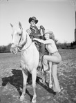 Southwestern Exposition and Fat Stock Show. Ora Mae Clark, North Side High School student. Helping her up on his Palomino is Weldon Woolridge, another North Side student. A boy on a horse helps a girl on a horse by grabbing her hand.