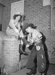 Southwestern Exposition and Fat Stock Show. Don Matheson helps Anabel Shotts. A little boy and a little girl dressed up in western attire as he helps her get ready to ride the McLean Junior High School range for a day.