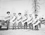 Southwest Exhibition and Fat Stock Show riders showing state banners. Left to right, Grafton Nuckels, Cleburne; Bill McMaken, Chandler Arizona; Mickey McCrorey, Reno, Nevada; Steve Peacock, Billings, Montana; Homer Pettigrew, Springer, New Mexico and Zack McWiggins, Newhall, California. A group of six men holding their state banners to represent the ranges that are battling it out for the $40,000 in prizes at the rodeo.