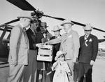 Amon Carter and group at the Southwestern Exposition and Fat Stock Show. Amon Carter is standing outdoors with a group of five men in front of an helicopter. A young boy is standing in front of Carter, wearing a hat and an overcoat over his outfit. Carter and the men are wearing suits and hats. One of the men is dressed in a pilot uniform and is holding a wooden crate with a pig inside.
