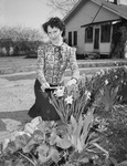 Mrs. L. B. Gary is shown with a giant daffodil in her garden. She is wearing a long-sleeved, patterned shirt and a long dark skirt. She is also holding up some measuring tape next to the daffodil which measures five inches in diameter. Around her is the rest of her garden and behind her is a house. Mrs. Gary is a member of the gardening department of the Woman's Club and the South Side Garden Club.