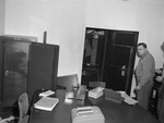 Ben E. Keith Company robbery. Ed Hands, comptroller, looks over the work of burglars who rifled four safes in the firm's general office. Mr. Hands is shown standing by a vault door blown open by the intruders. In the foreground, there is a large table with various office supplies scattered about it. There are also a few other papers on the floor as well. Another person stands behind Mr. Hands.