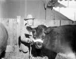 Southwestern Exhibition and Fat Stock Show Champions. Howard C. Preslar, San Angelo, and his prize winning Aberdeen-Angus. A boy wearing Western attire and kneeling next to his cow.
