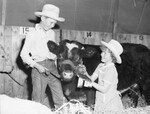 Southwestern Exhibition and Fat Stock Show Champions. Billy Quinn Cliett, FFA boy from Whitney, with his sister, Joyce Lee. A little boy proudly showing his sister the blue ribbons awarded his Shorthorn steer, "Doss," in the Boys' Baby Beef Show.