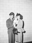 Corporal and Mrs. Don W. Pinson and daughter. A Military man reunited with his wife and daughter after being separated for almost two years. The woman standing holding the child next to her husband.