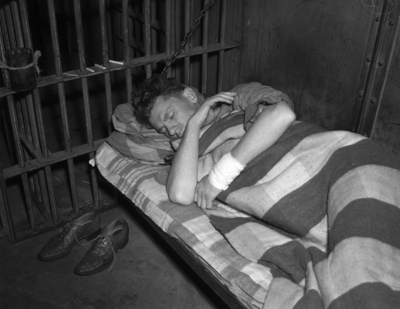 Virgil Harris, a convict from Iowa engaged in a gun battle with two Texas State Patrolmen near Lewisville Saturday night. The officers, Banks and Beasley were stopping Mr. Harris' car when he began shooting. Patrolman Banks suffered a gunshot to the arm. Mr. Harris received four bullet wounds in the pistol duel. He is shown on a bunk in the Denton County Jail, nursing his wounds.