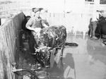 Southwestern Exposition and Fat Stock Show. Amos Fox of Lansing, Michigan, scrubbing a yearling Shorthorn bull. A man is washing a bull, preparing the animal for the breeding division judging.
