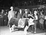 Southwestern Exposition and Fat Stock Show. Champions. Gaylord Stone, second from right, president of Universal Mills, presents check to Stuart Henderson. Others, left to right, are John C. Burns and Alex McDonald. Three men and one boy standing behind a cow as the president of Universal Mills presents a check to the little boy.