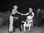 Southwestern Exposition and Fat Stock Show. Left, Howard C. Preslar, San Angelo, and his Aberdeen-Angus, reserve grand champion, and Stuart Henderson of Hyman and his Hereford, grand champion. Two boys that won championship shake hands across their cattle in between them.
