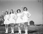 Southwestern Exposition and Fat Stock Show. Jacksboro High School drum majors, left to right, Nancy Snyder, Helen Grace Isaacs, Shirley Jean McBride, and Gerrie Moss. Jacksboro drum majors strutted while the band played a concert in front of the Will Rogers Memorial Coliseum. Four girls standing next to each other holding drum sticks.