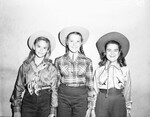 Southwestern Exhibition and Fat Stock Show. Young visitors. Ellen Roeser, Jane Leonard and Janet Taylor. Three girls standing next to each other wearing western attire and hats.