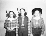Southwestern Exhibition and Fat Stock Show. Young visitors. Joyce Evans, Jean Allen and Olive Ruth Jones. Three little girls standing next to each other wearing western attire and hats.