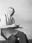 Joseph E. Taulman, 79, died of heart attack March 19, 1946. He is shown sitting in a chair at his home and setting a headline for the Star-Telegram, where he had worked for 20 years. His "Taulman Collection" of Texas historical material is now a part of the archives section of the University of Texas library. He is wearing a tied apron and a pair of striped trousers. He is also wearing a pair of eyeglasses and looking off to his left.