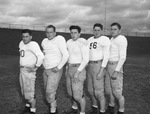 Texas Christian University (T. C. U.) football. M. E. (Stumpy) Owens, Frank Baker, Douglas Brightwells, John Stoneham and Allen Pike. The five football players are shown standing on the football field in a line. Each one of them is dressed in a football uniform which includes a jersey with their respective number and fpptball pants. In the distance, a fence can be seen bordering the field.