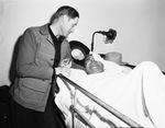 George Mills leaning over the hospital bed of Jasbo Fulkerson, stock show rodeo clown. Fulkerson suffered injuries in Monday nights' show when a Brahma bull gored him.