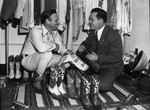 Southwestern Exhibition and Fat Stock Show. Charles E. McKesson, right, Gene Autry left, looking at some of Autry's boots. Mr. McKesson holds the boot he re-heeled for Mr. Autry.