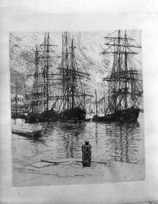 "Ships in Venice," by Otto Bacher. In the painting there are a fleet of ships in the ocean.