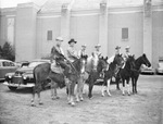 Southwestern Exhibition and Fat Stock Show. Waco Longhorn Club. Left to right, Roy Durie, Arthur L. Murphree, Paul Self, J. I. Paulk, Johnny Blackburn and Claud Giddens. Six men on horses in front of a building ready to parade for rodeo crowds at the Will Rogers Memorial Coliseum.