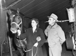 Miss Betty Thomas, trick rider, and Wayne Dennis, both of Ozark, Missouri and associated with Jack Raum rodeo enterprises, visit "Little Man," a 5 years old Quarterhorse owned by the King Ranch, of Kingsville.