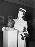 Art. Margaret Kennard of Denton, Texas. Miss Kennard was a visitor to the art gallery in the public library where her sculpture, "Diorite", the kneeling, bowing figure of a woman, won first prize in the exhibit of West Texas artists. Miss Kennard is shown standing behind her sculpture with her hand on the podium the piece is displayed on. She is wearing a buttoned up jacket and a long skirt. In her other hand she is holding her dark gloves, while her clutch stays in her arm. She looks on at her art piece.