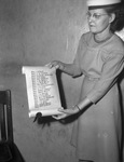 Tarrant County Federation of Christian Church Women. Golden Deeds scroll. The federation honored 20 members of the organization at a "Golden Deed" luncheon at First Christian Church. In the picture, an unamed woman is standing in front of an empty wall holding up the list of women that were declared the "Golden Deed" women. In front of her is a wooden chair.