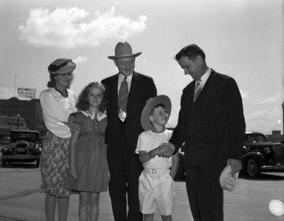 The William O. Douglas family arrived in Fort Worth, Texas, to take its Supreme Court justice away for a vacation. The latter is greeting his wife and his 10-year-old daughter, Mildred, at the Texas and Pacific Station, while Federal Judge James Allred gives 8-year-old William a handshake. Standing left to right, they are Mrs. William O. Douglas, Mildred Douglas, Judge William O. Douglas, William Douglas, and Judge Allred. The men are wearing suits, young William is wearing a t-shirt and shorts, and Mrs. Douglas and her daughter are wearing dresses.