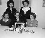 River Oaks Garden Club. Festival Committee. Seated left to right: Mrs. Sam Egnot, Maurice Grant and Hugh Newman. Standing, Mrs. George de Faller and Gus Beall. The group of women are shown smiling at a small display decoration on the table in front of them. The display includes a small figure with a hat and some small leaves draped over the setting. Each of the ladies are dressed in long, dark dresses, either short-sleeved or long-sleeved. The table is also covered in a large cloth. Behind the group of women is a door.