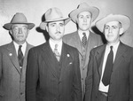Group photograph of (Left to right,) Bob Mason of Fort Worth, Doctor Gustavo Rivas, Venezuelan Department of Agriculture; Leroy A. Hampton, New Orleans, president of Hampton Company, livestock shippers, and James S. Dunne, New Orleans, traffic manager for the Grace Lines. The men are all wearing coat and ties and hats.