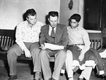 From Laredo for the Southwestern Exposition and Fat Stock Show track meet are, seated left to right, Assistant Coach Art Lang, Coach R. W. Parker, and Hector Rocha, athlete. They are checking meet records that Coach Parker is holding.