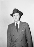 Ray Hammond. Mr. Hammond is shown standing in front of an empty wall and smiling slightly. He is wearing a double breasted suit jacket and a brimmed hat. He is a veteran of 56 missions as a bomber pilot in the 15th Air Force. He is native of Waco, Texas, but him and his wife, Miss Elaine Simmons, hope to relocate to Fort Worth, Texas.