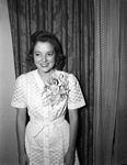 Mrs. Lacy McClanahan, the former Miss Mary Helen Lancaster, was married on Friday, July 5, 1940, at University Christian Church. She is the daughter of Mr. and Mrs. B. H. Lancaster, of Longview, Texas, and the niece of Mrs. B. U. Sears. Both Mr. and Mrs. McClanahan are Texas Christian University graduates. Mrs. McClanahan is standing in front of a curtain, wearing a dress with a large corsage pinned to the bodice. She is smiling.
