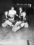 Beaumont High team, seated on the gym floor and unpacking their bags (left to right), Jimmie Hollis, Paul Leming, Edwin Smith and Carl Renken. They are wearing their letter jackets.